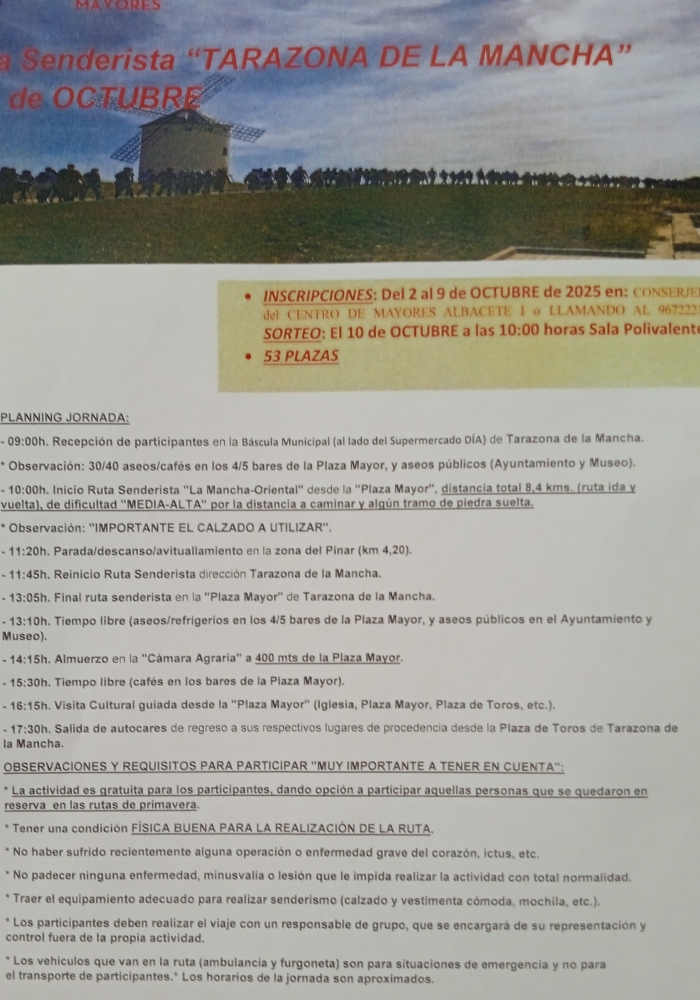 - 09:00h. Recepción de participantes en la Báscula Municipal (al lado del Supermercado DÍA) de Tarazona de la Mancha.