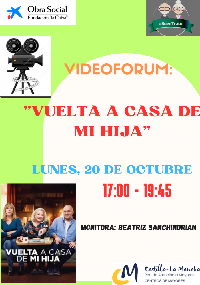 Tras el taller del buen trato y como colofón tras la realización de éste se realizará un videoforum con la proyección de la película "VUELTA A LA CASA DE MI hija". En esta pelicula "Vuelta a casa de mi hija" es la madre Jacqueline, de obras en su casa, la que se ve obligada a irse a vivir algunos días a casa de su hija mayor Carole y de su yerno, ambos en plena terapia de pareja. Los "algunos días" se acaban convirtiendo en "algunos meses". Y en todo ese tiempo Jacqueline se siente como en su casa, prepara las cenas, acapara la tele, cambia la cocina...
