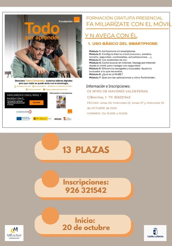 - Módulos: Así funciona mi smartphone, configura biune tu móvil (volumen, sonidos, tamaño, seguridad, contraseñas, actualizaciones), los asistentes de voz, como buscar en iternet, navegar con seguridad, diferencias entre navegadores, ajusta tu buscador a lo que necesitas, ¿qué es la nube?, qué son las aplicaciones y como funcionan.