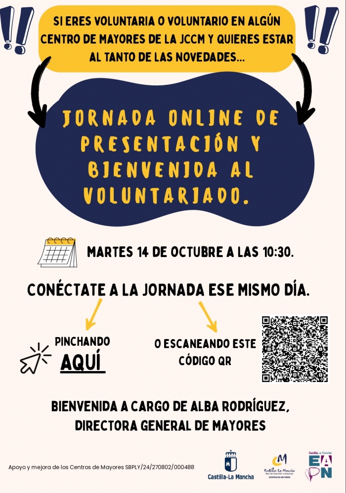 Acorde al Plan de Voluntariado de los Centros de Mayores de la Junta de Castilla-La Mancha que se ha puesto en marcha este año, nos complace invitar a todas las personas que realizan una acción voluntaria en estos recursos a la primera sesión formativa de este Plan el próximo día 14 de octubre a las 10:30.