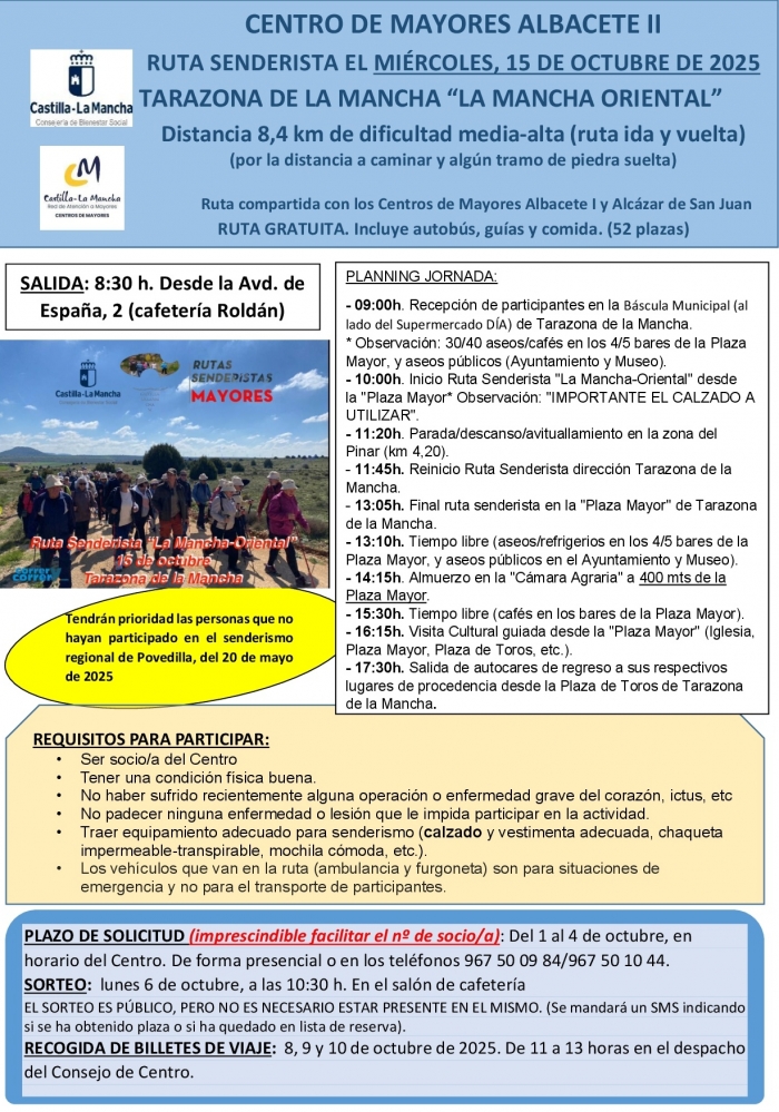 - 09:00h. Recepción de participantes en la Báscula Municipal (al lado del Supermercado DÍA) de Tarazona de la Mancha.