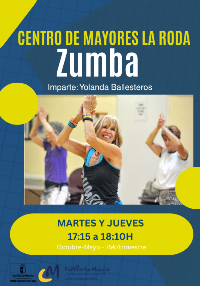 Zumba es una disciplina deportiva que se imparte en clases dirigidas en la que se realizan ejercicios aeróbicos al ritmo de música latina (merengue, samba, reggaeton, cumbia y salsa). A finales de los 90 el colombiano Alberto Pérez desarrolló esta filosofía deportiva que combina el acondicionamiento físico, el entretenimiento y la cultura del baile para fomentar el ejercicio. En la actualidad esta disciplina, zumba fitness, es una de las más demandadas en España y se practica en más de 185 países, no pudiendo nuestro Centro de Mayores quedarse fuera de este amplio abanico.