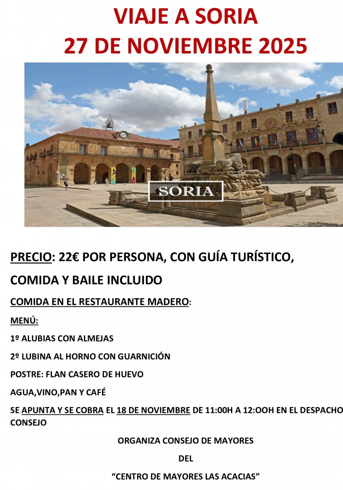 VIAJE A SORIA CON GUÍA TURÍSTICO, COMIDA Y BAILE .