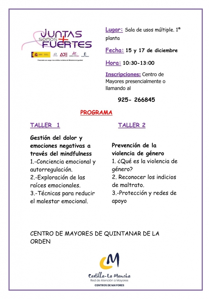 Dentro de los proyectos de la Asociación de Jóvenes empresarios y empresarias de CLM (AJE) se desarrollarán dos bloques de sesiones, la primera versará sobre Gestión del dolor y emociones negativas a través del mindfulness y la segunda sesión sobre la prevención de la violencia en mujeres mayores de 65 años.
