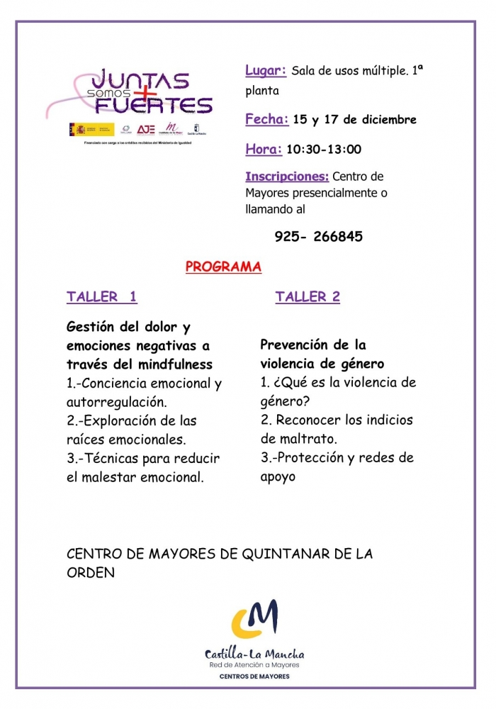 Dentro de los proyectos de la Asociación de Jóvenes empresarios y empresarias de CLM (AJE) se desarrollarán dos bloques de sesiones, la primera versará sobre Gestión del dolor y emociones negativas a través del mindfulness y la segunda sesión sobre la prevención de la violencia en mujeres mayores de 65 años.