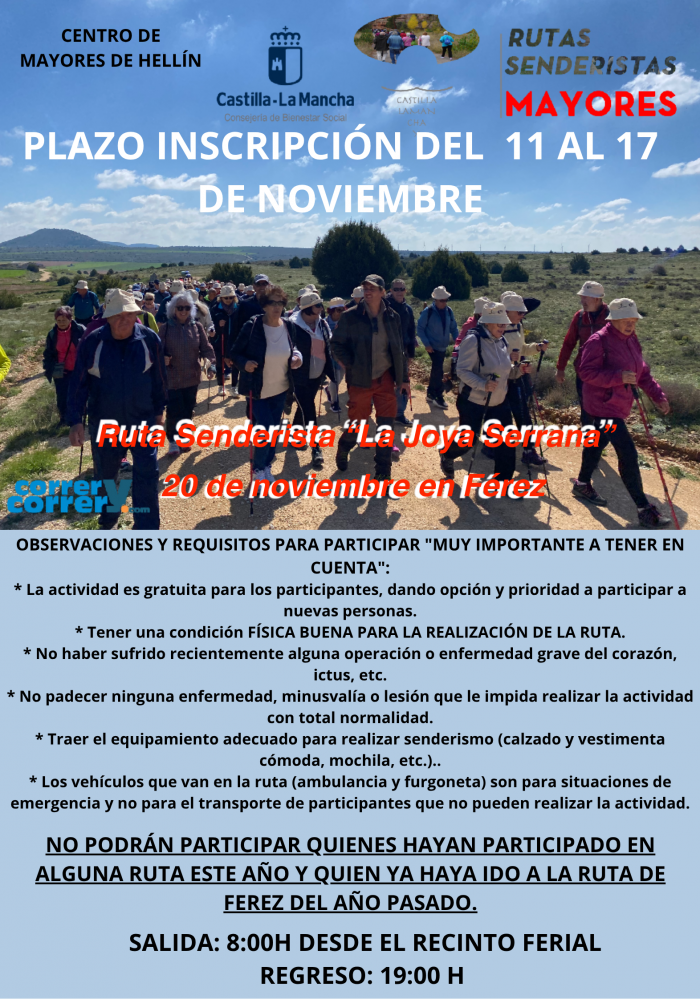 - 10:30h. Inicio Ruta Senderista "La Joya Serrana" desde la Pista Cubierta, distancia total 7 kms. de dificultad "MEDIA-ALTA".