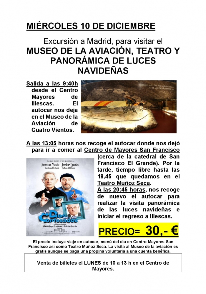 Excursión a Madrid para realizar visita guiada al Museo de la Aviación, con comida en el Centro de Mayores de San Francisco, y por la tarde teatro en el Teatro Muñoz Seca con "Que Dios nos pille confesados" además de terminar dando una vuelta con el bus para ver las luces navideñas del centro.