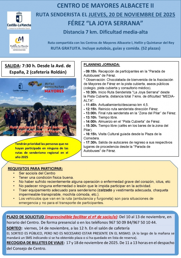 * Observación: Chocolatada de bienvenida de la Asociación de Mayores de Férez en la pista cubierta, aseos públicos (colegio, pista cubierta y consultorio médico).