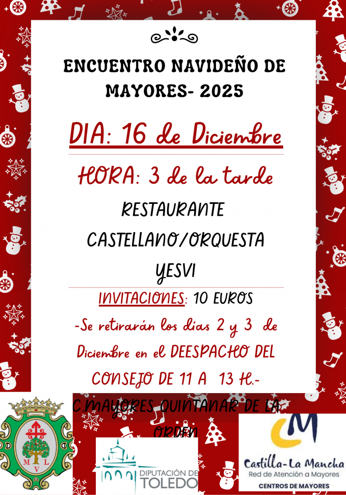 La Fiesta-Encuentro de Navidad del Centro de Personas Mayores, se celebrará el día 16 de Diciembre en el Restaurante del Hotel Castellano de la localidad. La actividad pretende crear un espacio de convivencia y participación entre todos nuestros socios/as. Por otro lado, también se contará con la asistencia de autoridades autonómicas y representantes de la Corporación Municipal. El acto comenzará a las 15:00 h. dando lugar a un almuerzo para los asistentes y culminando en un baile dirigido por el Grupo local "DUO YESVI". Los interesados podrán recoger las invitaciones los días 2 y 3 de Diciembre en el despacho del Consejo de 10:00 a 13:00 h.