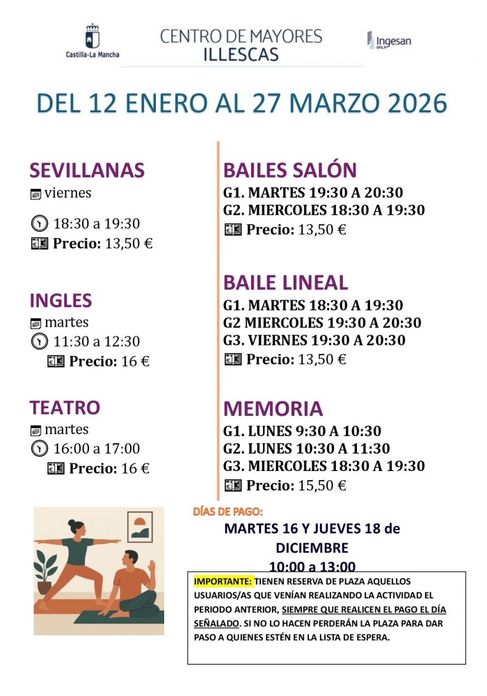 Taller de Teatro, con ensayos dirigido por Monitora, con una sesión semanal de 2 horas. Se ensaya una obra elegida, que luego será interpretada en publico en diversos eventos, entre ellos el Festival de Teatro de los Centros de Mayores de la provincia de Toledo.