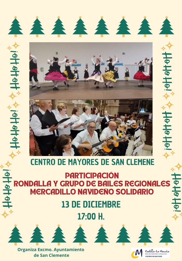 PARTICIPACIÓN EN EL MERCADILLO NAVIDEÑO SOLIDARIO ORGANIZADO POR EL EXCMO. AYUNTAMIENTO DE SAN CLEMENTE A BENEFICIO DE CARITAS PARROQUIAL Y VOLUNTARIAS DE LA CARIDAD, EL CENTRO PARTICIPA CON ADORNOS NAVIDEÑOS REALIZADOS POR SOCIAS DEL CENTRO Y CON RECITAL DE VILLANCICOS A CARGO DE LA RONDALLA DEL CENTRO, ASÍ COMO EL GRUPO DE BAILES REGIONALES