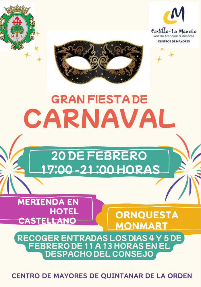 La Fiesta de Carnaval, se celebrará el día 20 de Febrero en el Restaurante del Hotel Castellano de la localidad. La actividad pretende crear un espacio de convivencia y participación entre todos nuestros socios/as; por otro lado, también se contará con la asistencia de autoridades autonómicas y representantes de la Corporación Municipal. El acto comenzará a las 17:00 h. dando lugar a una merienda para los asistentes y culminando en un baile dirigido por el Grupo MOMAR. Los interesados podrán recoger las invitaciones los días 4 y 5 de febrero a partir de 11 a 13 horas. La actividad será financiada íntegramente por cada uno de los participantes, con un costo de 11:00 euros.