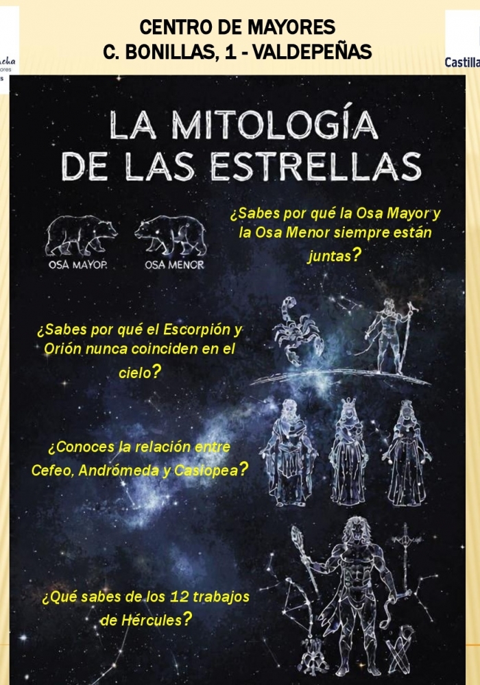 Entre las personas voluntarias del Centro de Mayores de Valdepeñas, el socio Juan Abellán realiza talleres educativos en torno a la historia y escritura. El taller propuesto para este trimestre es acerca de la historia mitológica y leyendas asociadas a la astronomía . Se trata de conocer las distintas constelaciones según las estaciones del año y su forma de observación.