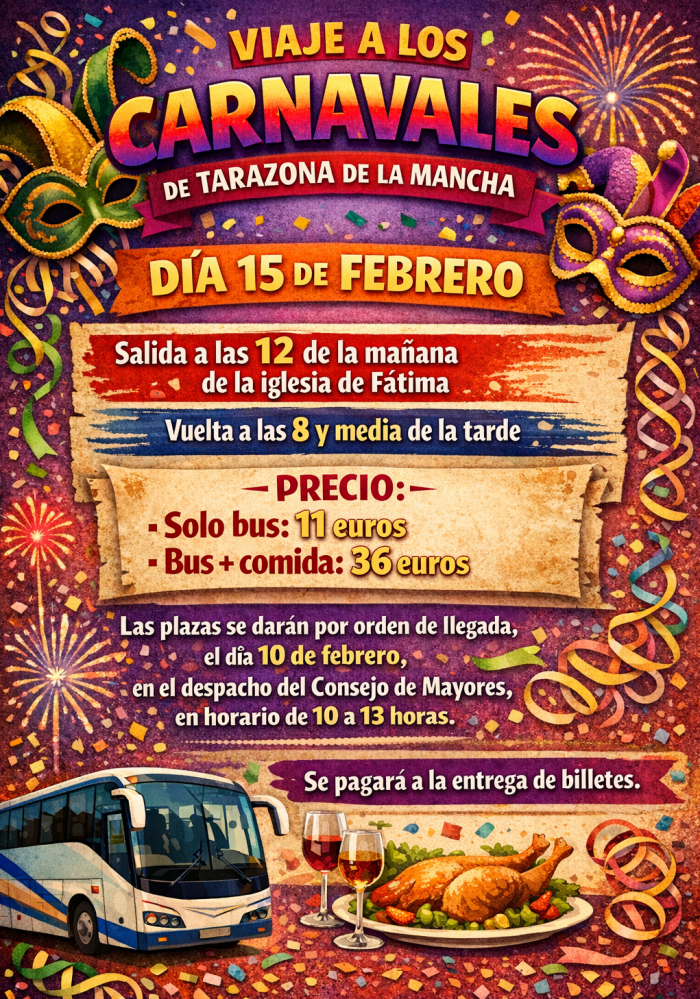 Visita al Carnaval de Tarazona de la Mancha el próximo domingo 15 de febrero: Salida a las 12 h desde la Iglesia de Fátima y vuelta las 20:30 horas de la tarde. Después de la llegada se visitará la plaza y quién haya optado por la comida de grupo, se comerá en el Centro Social de Tarazona de la Mancha. Posteriormente se disfrutará de su famoso desfile de disfraces así como de la fiesta que se congrega en la plaza del pueblo. Es un viaje reservado para socios y socias cuya inscripción/adquisición de billetes será por orden de llegada hasta llenar el autobús.