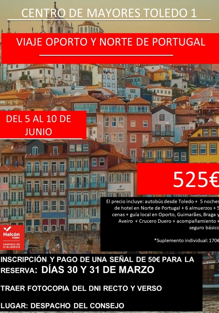 En esta ocasión, el viaje que se ha organizado tiene una duración de 6 días a la zona norte de Portugal, se visitarán diversas localidades como Oporto, Coimbra, Aveiro, o Guimaraes con guías oficiales, con actividades tan interesantes como de disfrutar de un paseo en barco por el río Duero o una degustación de vino de Oporto.