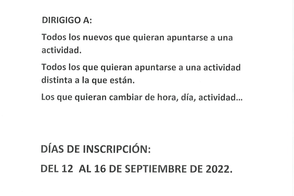 LISTA DE RESERVA DE ACTIVIDADES,Todos los nuevos que quieran apuntarse a una actividad ,todos los que quieran apuntarse a una actividad distinta a la que estan,los que quieran cambiar de hora ,dia, actividad..... deben inscribirse del 12 al 16 de Septiembre de 2022.