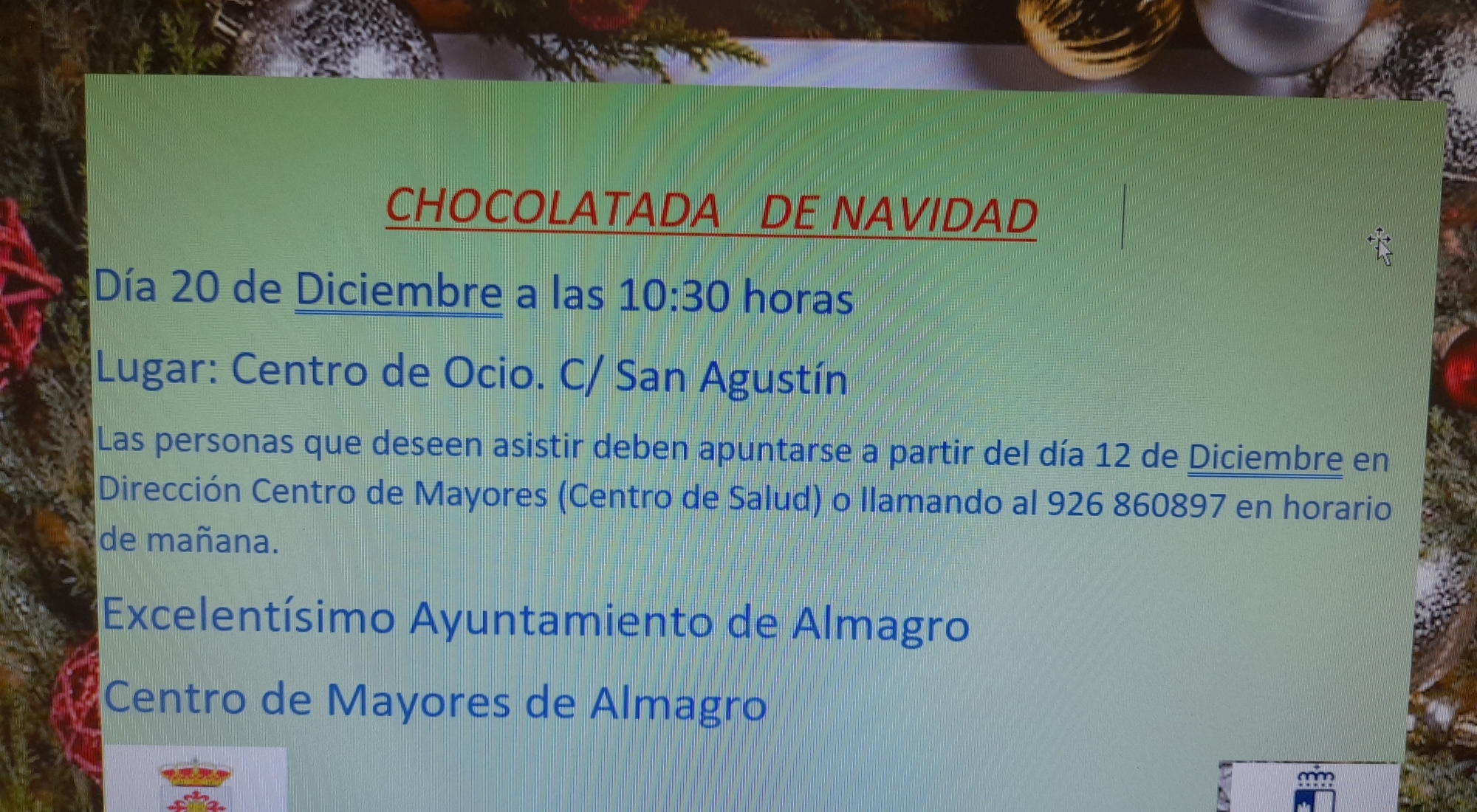 Día 20 de Diciembre a las 10:30 horas en el Centro de Ocio. C/ San Agustín. Para apuntarse dirigirse a Dirección del Centro de Mayores (Centro de Salud) o llamando por teléfono al 926 860897. Actividad organizada por el excelentísimo Ayuntamiento de Almagro y Centro de Mayores