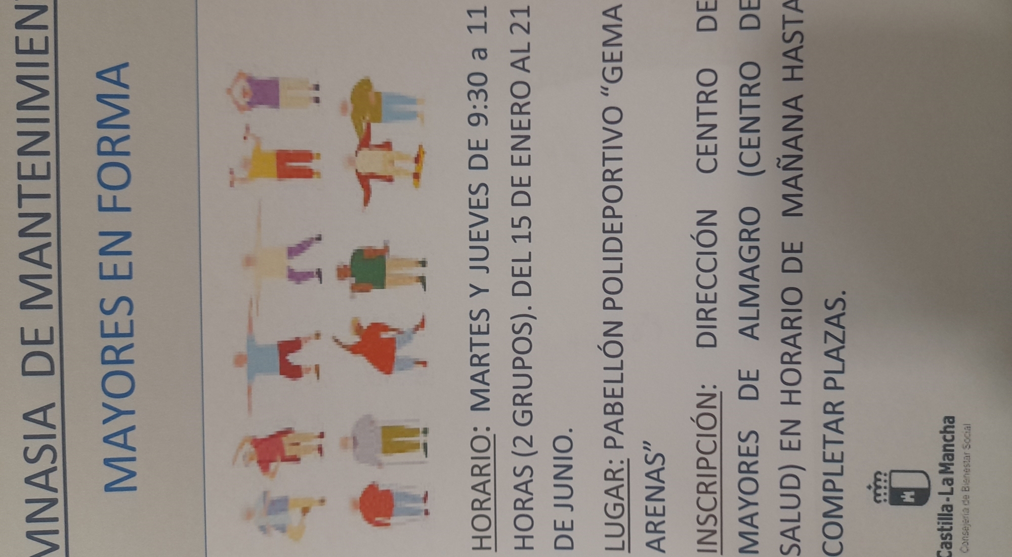 A través de la entidad Correr y Correr "Talleres del Bienestar" se va a realizar de nuevo la gimnasia de mantenimiento. Horario martes y jueves de 9:30 a 11:00 horas (2 grupos) en el pabellón polideportivo " Gema Arenas". Fecha de inicio 16 de enero hasta el día 20 de junio. Informción e inscripción en Dirección Centro Mayores( Centro de Salud) en horario de mañana.