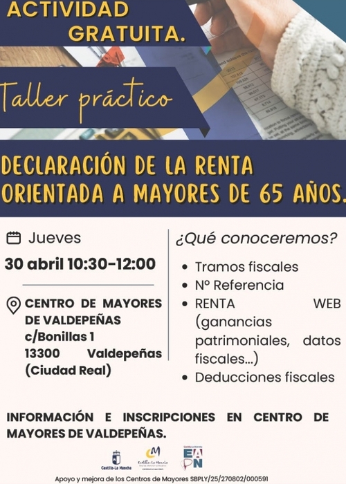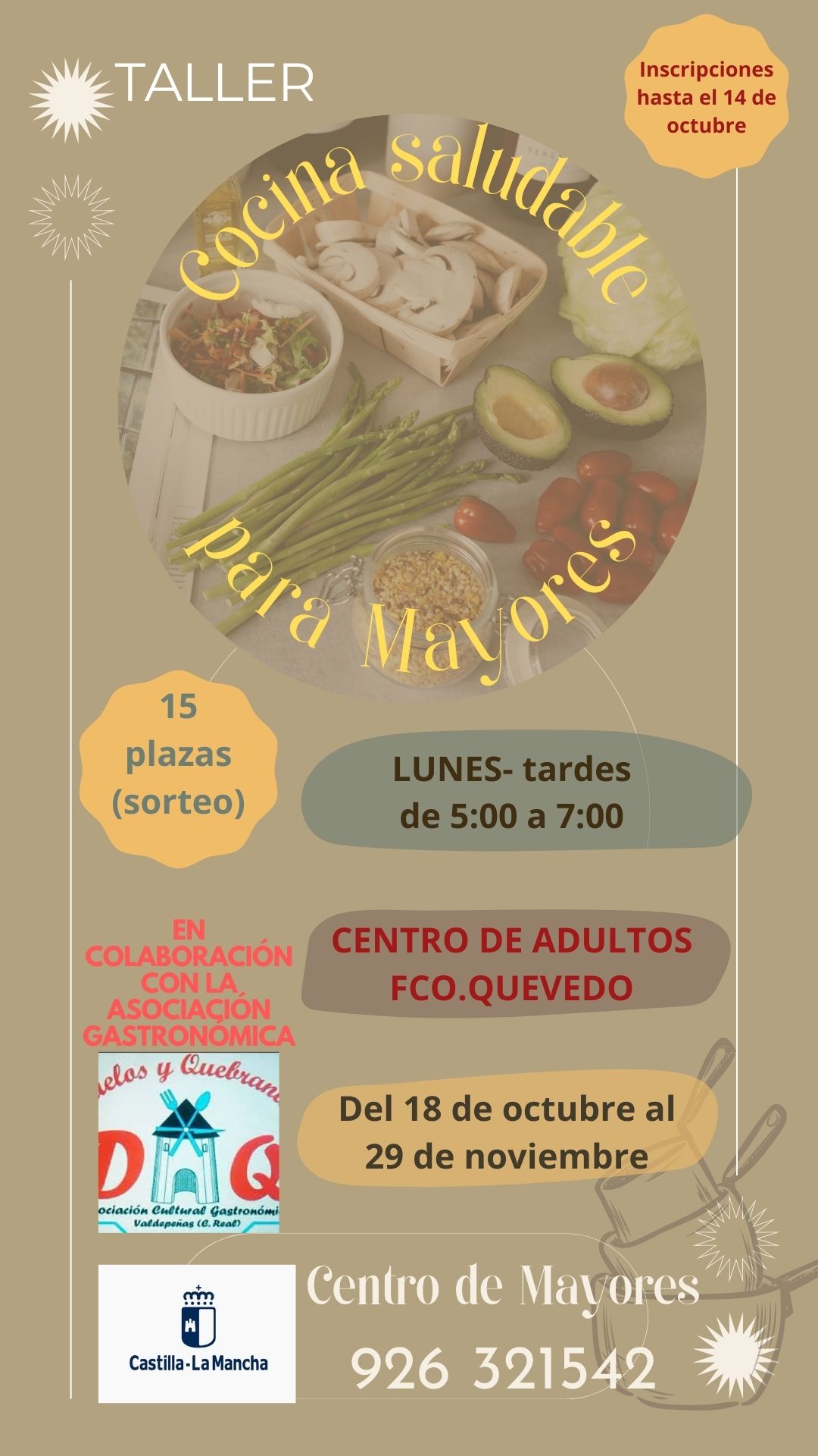 Taller de Cocina saludable en colaboración con la Asociación cultural y gastronómica de Valdepeñas, Duelos y Quebrantos" que se desarrollará en el Centro de Educación de Adultos Francisco de Quevedo, AVda. de los Estudiantes, con el fin de ofrecer un espacio de formación y relación en torno a la preparación de alimentos saludables para esta etapa de la vida.