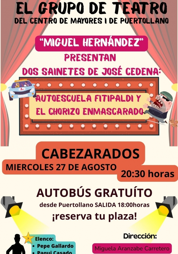 EL GRUPO DE TEATRO DEL CENTRO, ESTRENARÁ DOS SAINETES EN LA LOCALIDAD DE CABERARADOS, PONIENDO UN AUTOBUS PARA DESPLAZAR A LAS PERSONAS SOCIAS QUE QUIERAN ASISTIR Y ACOMPAÑAR AL ESTRENO DE ESTAS OBRADEL GRUPO DE TEATRO, REPRESENTANDO AL CENTRO FUERA DE LA LOCALIDAD
