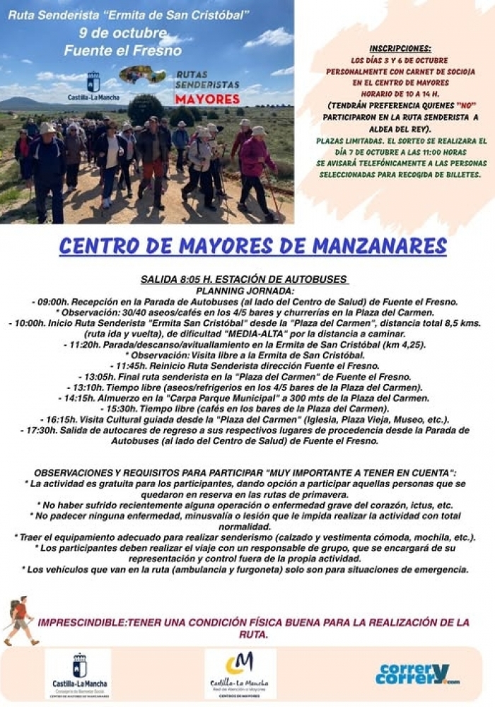 - 09:00h. Recepción de participantes en el Parada de Autobuses (al lado del Centro de Salud) de Fuente el Fresno.