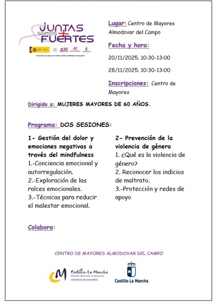 TALLER GESTIÓN DEL DOLOR MEDIANTE MINDFULNESS Y PREVENCIÓN DE LA VIOLENCIA DE GÉNERO, DIRIGIDO A MUJERES MAYORES DE 60 AÑOS. GRATUITO. IMPARTIDO POR LA AJE EN COLABORACIÓN CON EL INSTITUTO DE LA MUJER.