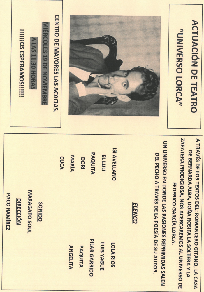 TEATRO EL DÍA 19 DE NOVIEMBRE A LAS 11:30H,DONDE SE REPRESENTARÁN TEXTOS DEL ROMANCERO GITANO,LA CASA DE BERNARDA ALBA,DOÑA ROSITA LA SOLTERA Y LA ZAPATERA PRODIGIOSA.