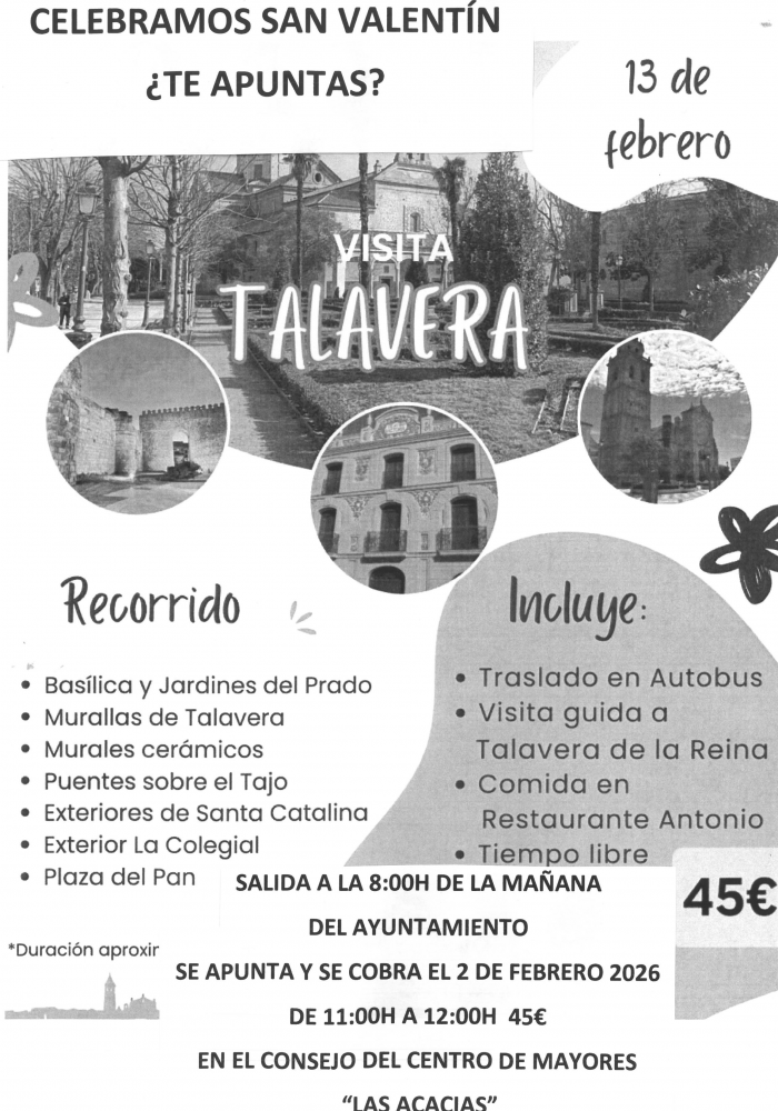 INCLUYE: TRASLADO EN AUTOBUS,VISITA QUIADA A TALAVERA DE LA REINA, COMIDA EN RESTAURANTE ANTONIO Y TIEMPO LIBRE.