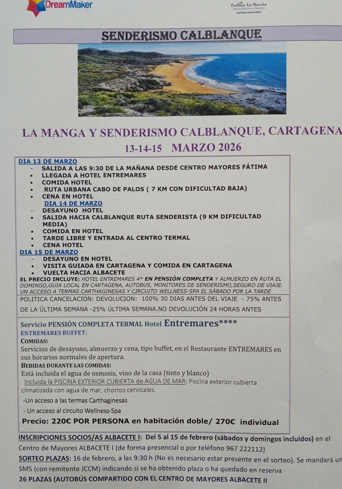 Viaje de tres días de duración donde se combina la actividad de senderismo por el Pueblo de Cabo de Palos, el paruque regional de Calblanque y Cartagena, con el turismo cultural.