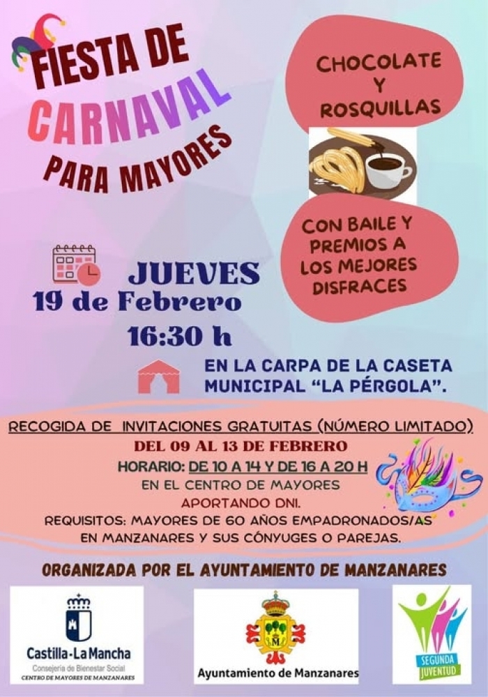 El próximo día 19 de febrero a las 16:30 horas en la carpa de la caseta municipal "La Pérgola" tendrá lugar la Fiesta de Carnaval para mayores organizada por el Excmo. Ayuntamiento de Manzanares.