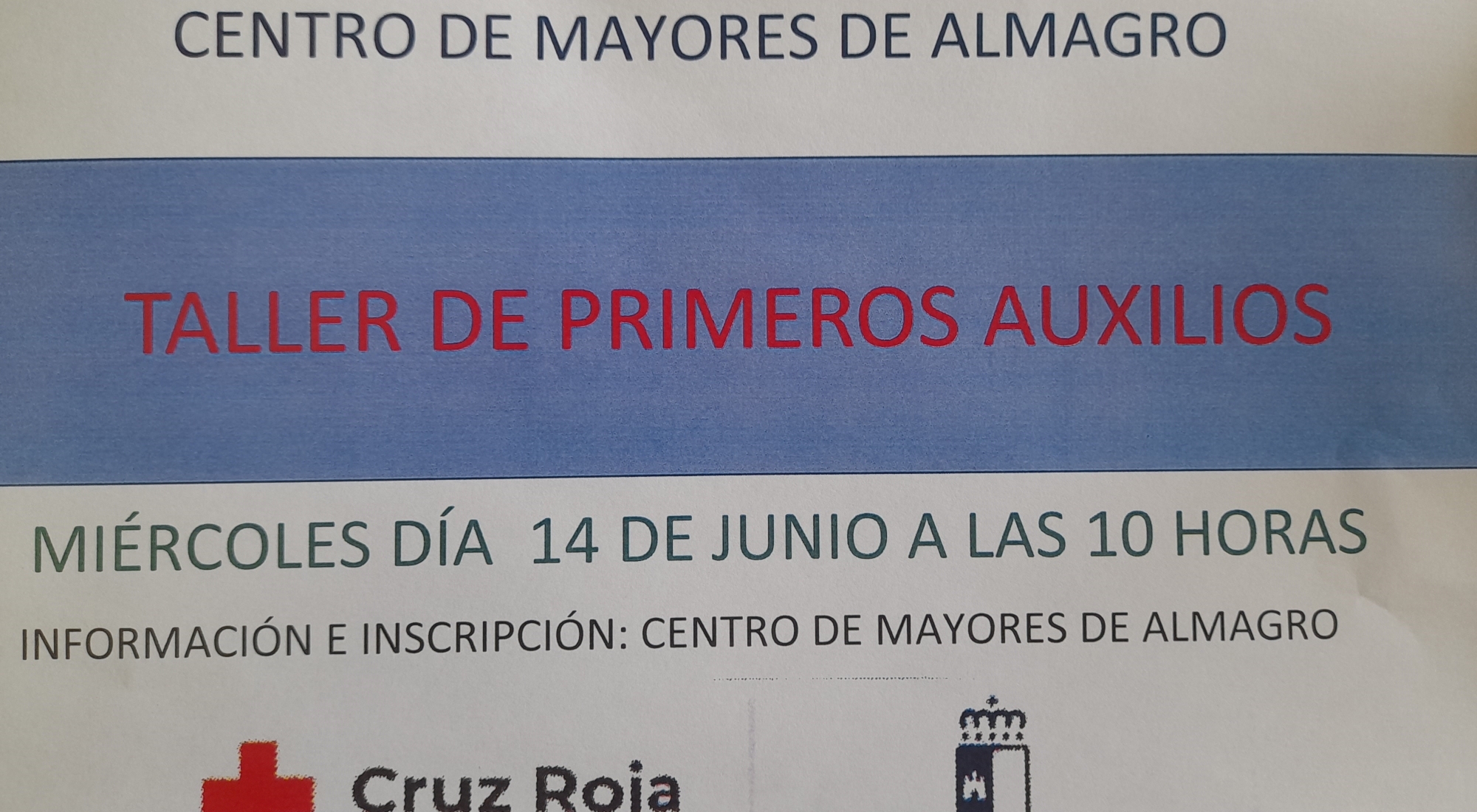 La Cruz Roja va a impartir un taller de primeros auxilios el miércoles día 14 de Junio a las 14 horas en el Centro de Mayores. Te esperamos